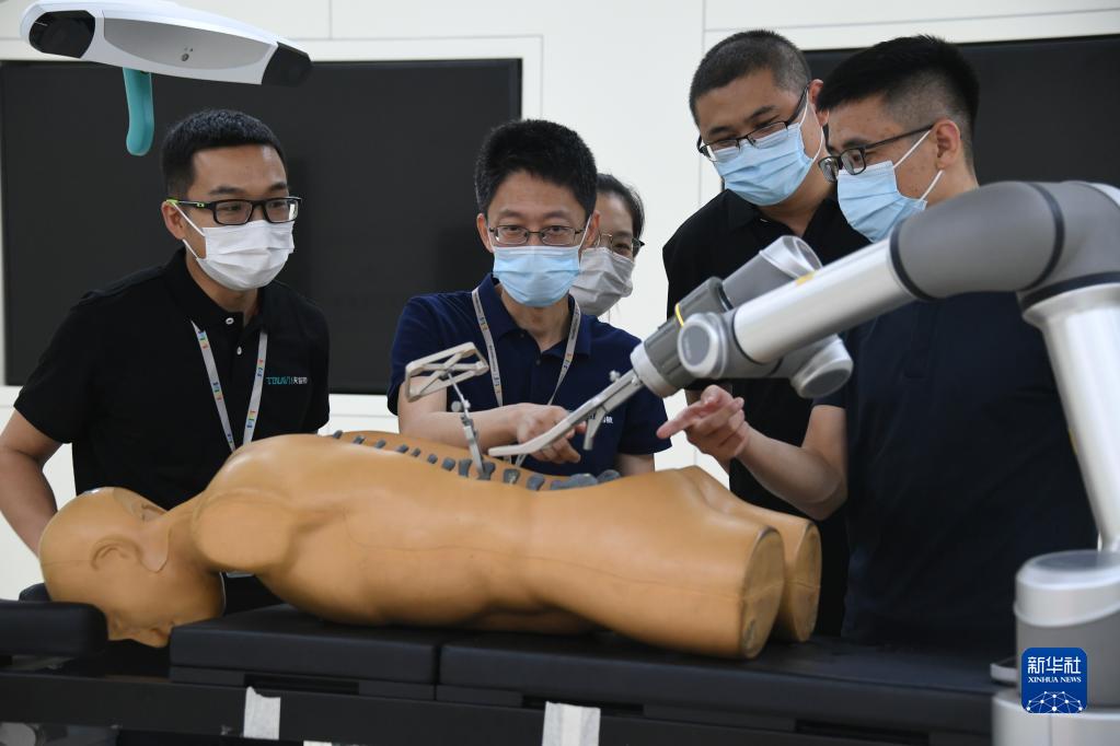 在北京天智航医疗科技股份有限公司实验室,刘铁昌(左二)与同事讨论骨科手术机器人机械臂在使用中的优化方案(8月4日摄)。