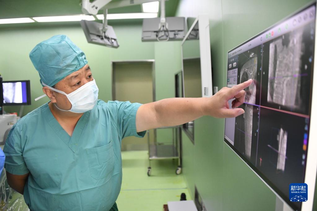 在北京市海淀医院手术室,手术医生魏更生通过骨科手术机器人显示的信息制定手术方案(8月3日摄)。