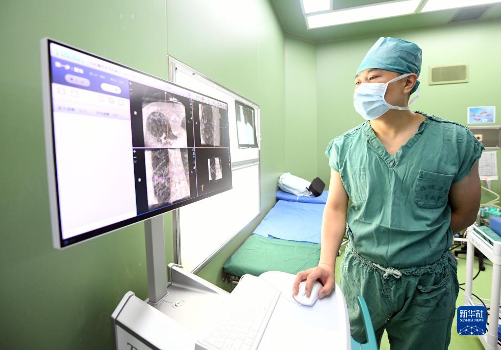 在北京市海淀医院手术室,手术医生设计骨科手术机器人的穿刺路线(8月3日摄)。