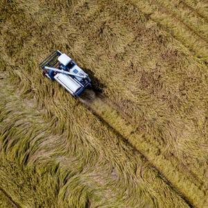 9月20日,在宁夏石嘴山市平罗县境内的前进农场,农民驾驶收割机收割水稻(无人机照片)。