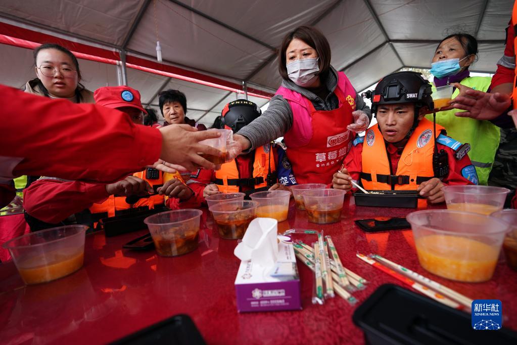 10月12日,在山西省稷山县滨河广场,“阿姨团”成员为来吃饭的抢险人员端上饭菜。