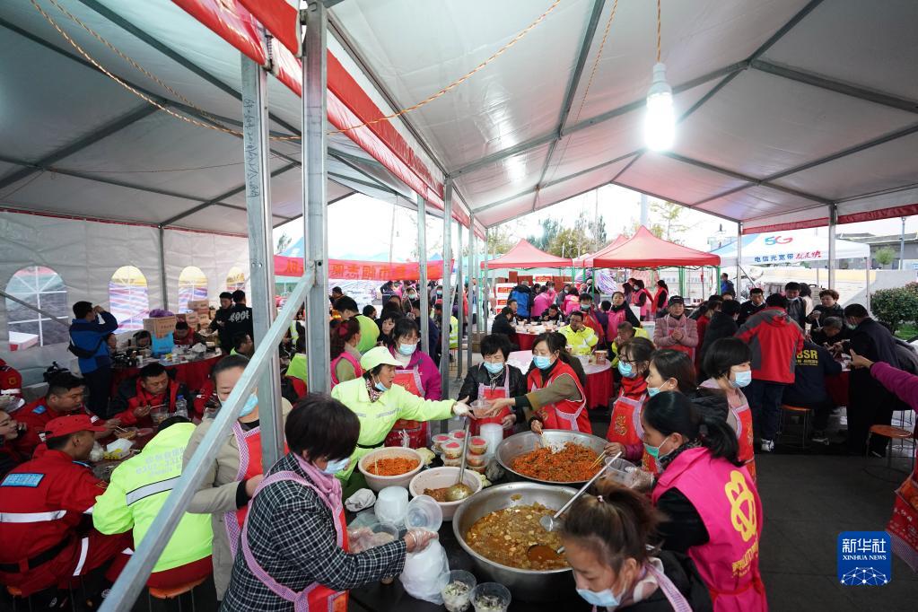 10月12日,在山西省稷山县滨河广场,“阿姨团”成员为来吃饭的抢险人员盛饭菜。