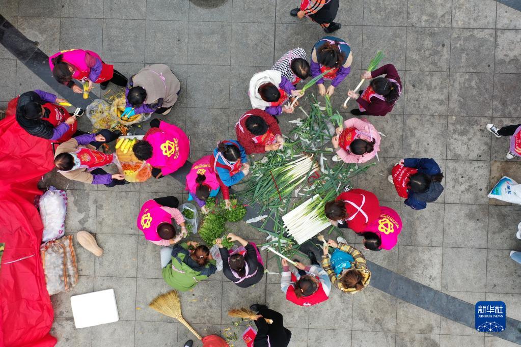 10月12日,在山西省稷山县滨河广场,“阿姨团”成员们在准备大葱等食材(无人机照片)。