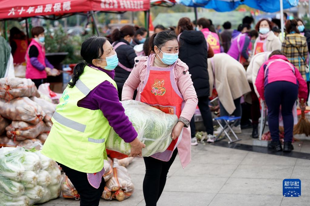10月12日,在山西省稷山县滨河广场,“阿姨团”成员们在搬运大白菜。