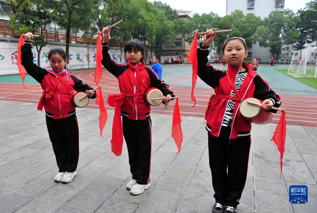 10月29日,湖北省宜昌市秭归县实验小学学生在艺术创作课上进行腰鼓训练。