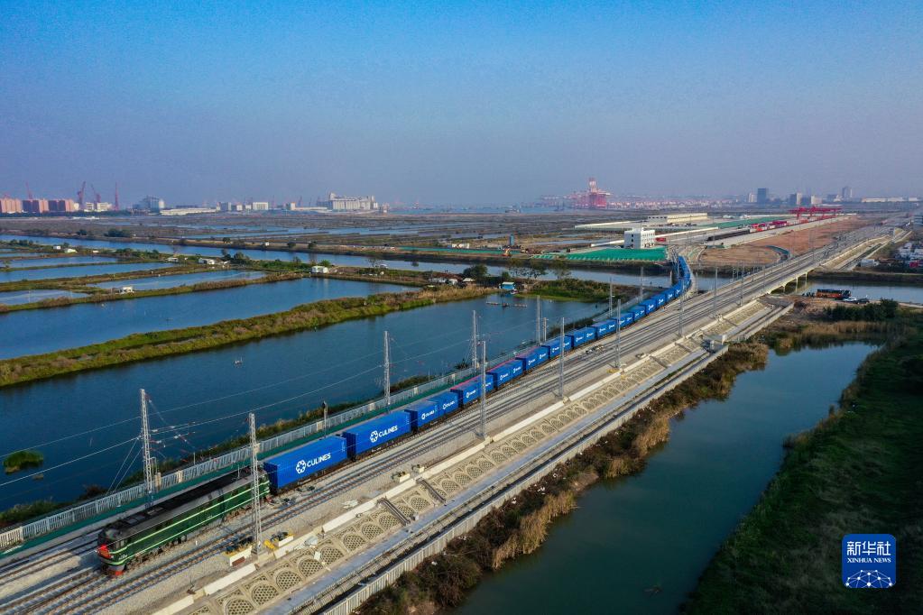 2021年12月31日,南沙港铁路首个集装箱班列从南沙港开出。
