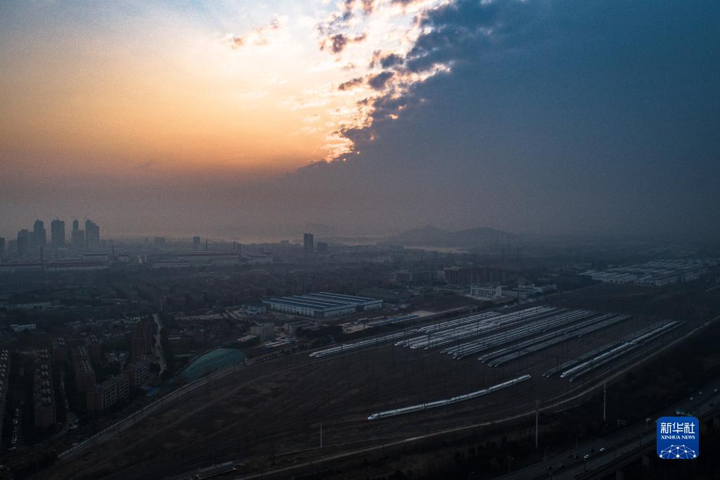 当日是2022年第一天,朝阳升起,万象更新。几十组动车经过武汉动车段工作人员通宵检修后,在黎明时分陆续驶出,迎接新一天的旅客。