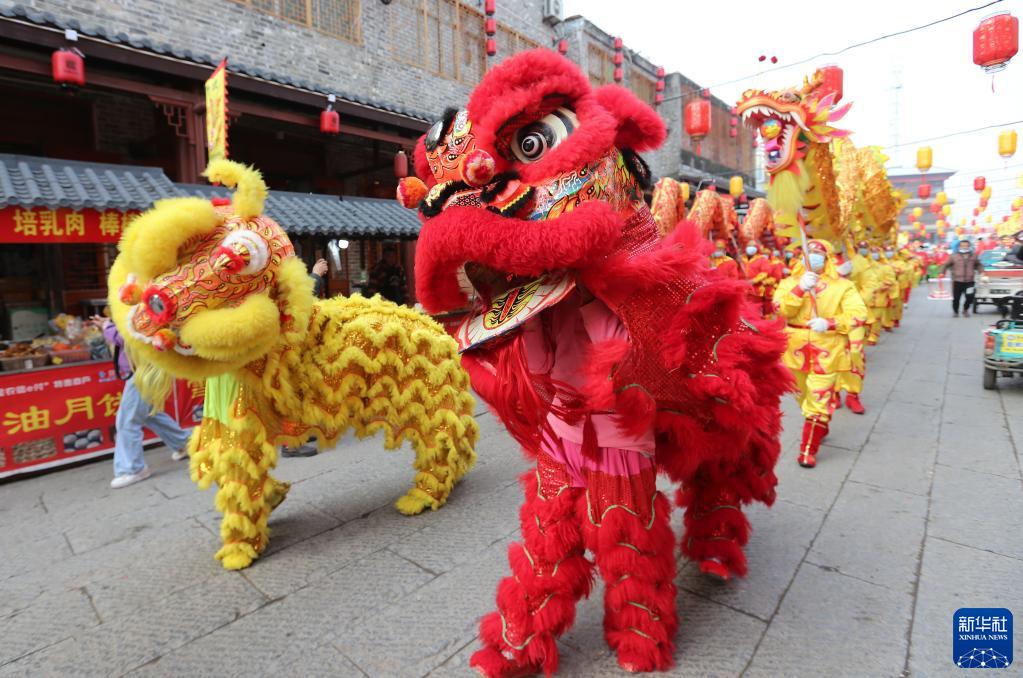 1月30日,在安徽省淮北市濉溪县临涣古镇,民间艺人在表演舞狮。