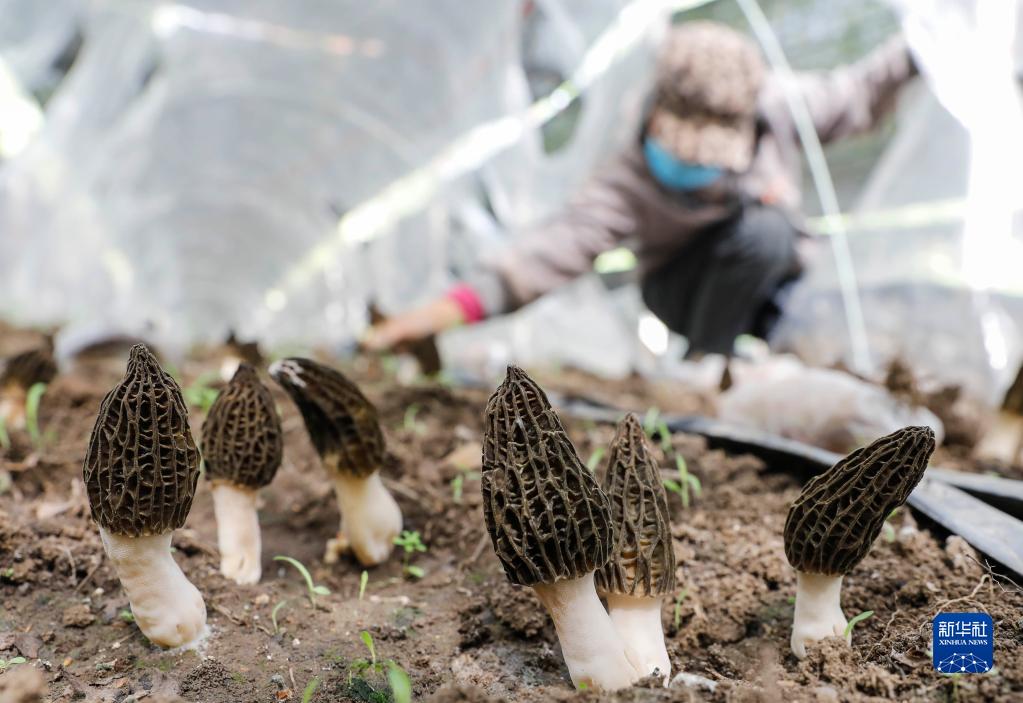 4月13日,农民在宝丰县张八桥镇斋公庄村林下食用菌种植基地采摘羊肚菌。