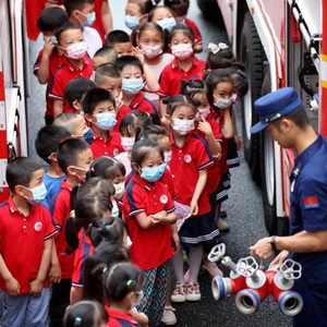 “六一”儿童节临近,湖南省资兴市消防救援大队举办开放日活动,资兴市小红花幼儿园30余名小朋友走进消防站,参观了解消防装备,学习消防知识,增强安全意识。新华社发(李科摄)