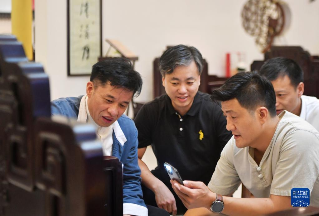 陈玉树(左一)与木雕省级非遗传承人林飞鹤(左三)、吴立波(左二)和林青(右一)共同探讨古典家具制作技艺(6月10日摄)。 新华社记者 魏培全 摄