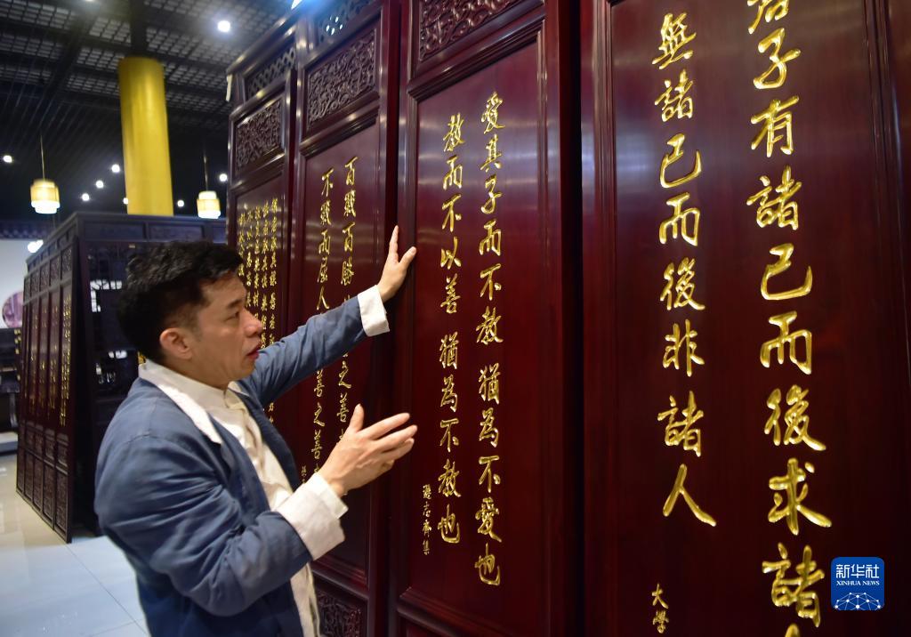 陈玉树在介绍他创作的红木屏风家具作品。这款海外华侨订制的古典家具作品将发往新加坡(6月10日摄)。 新华社记者 魏培全 摄