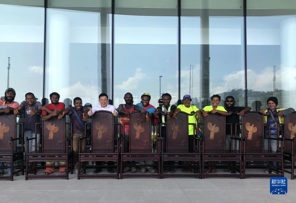 陈玉树(左五)与巴布亚新几内亚工人一起拼装亮相2018年巴布亚新几内亚APEC会议上中国古典家具作品《祥瑞》(2018年10月23日摄 ,手机资料照片,受访者提供)。 新华社发