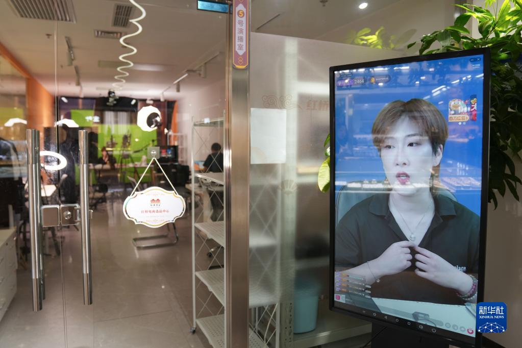 6月18日,在北京市东城区红桥市场的红桥电商直播基地内,工作人员在直播间内销售珍珠饰品。