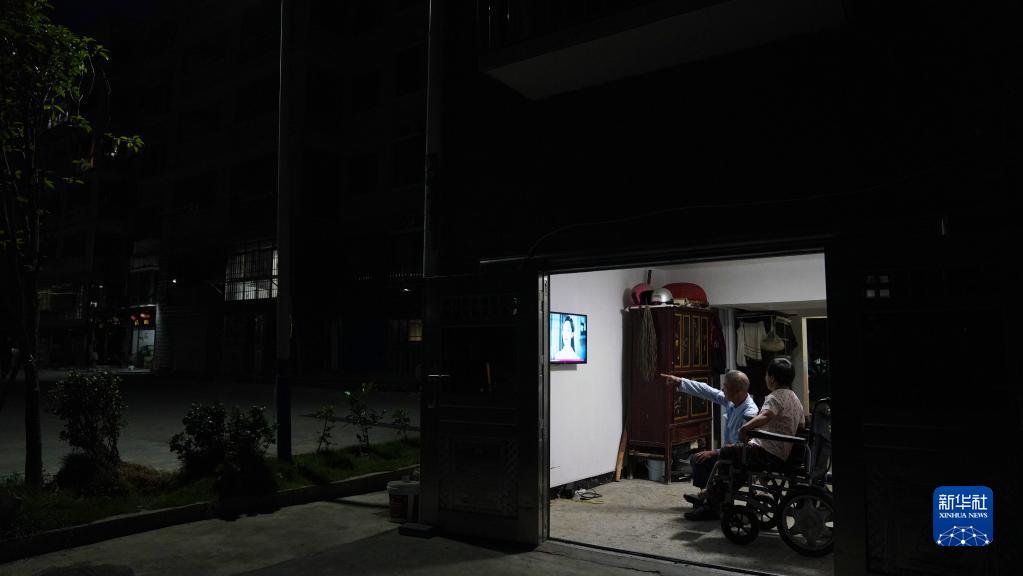 6月17日,廖斌晟在家陪女儿看电视。新华社记者 胡晨欢摄