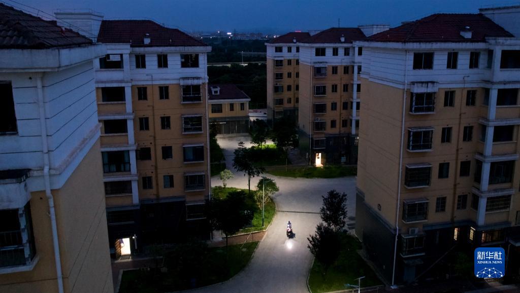 6月16日,廖斌晟推着坐在轮椅上的女儿一起在小区内散步(无人机照片)。新华社记者 胡晨欢摄