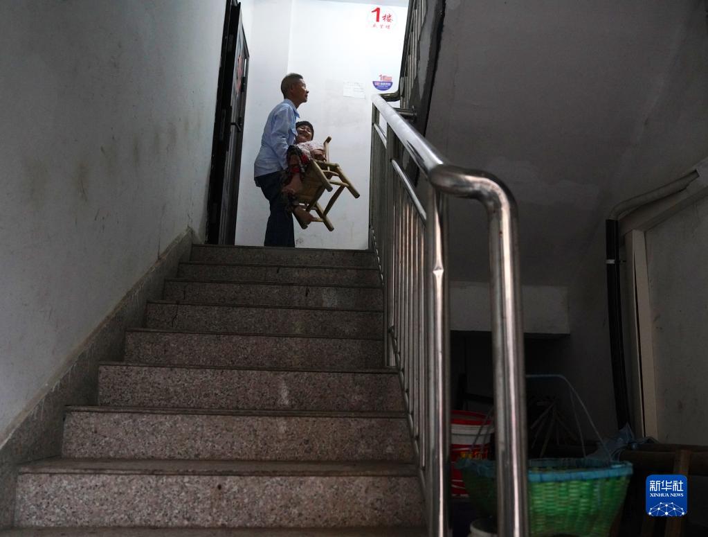 6月17日,廖斌晟抱着女儿上楼梯回家。新华社记者 胡晨欢摄