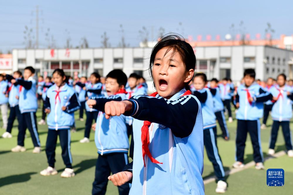 11月10日,在日照市莒县洛河镇中心小学,同学们在阳光大课间参加武术健身操活动。