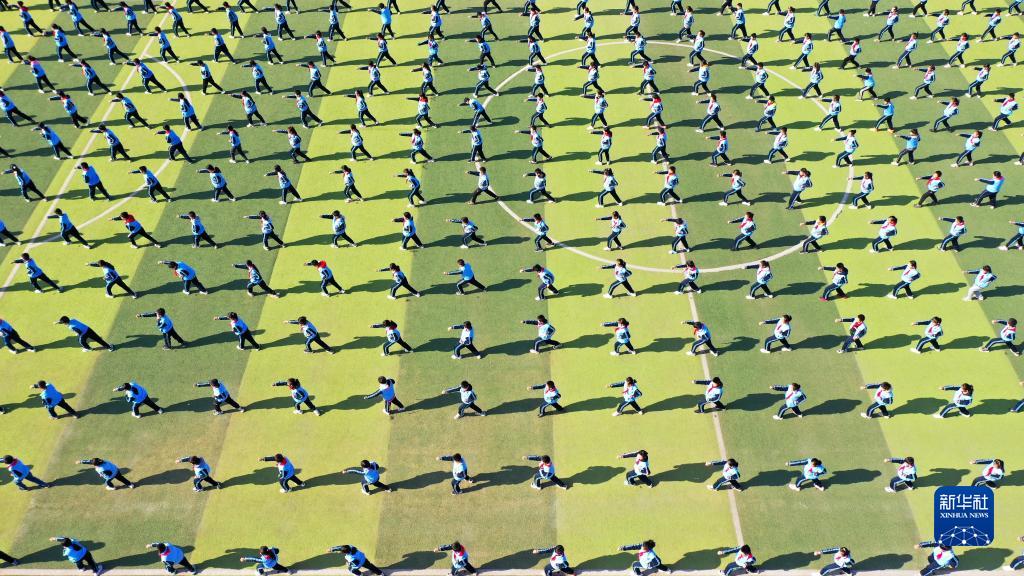 11月10日,在日照市莒县洛河镇中心小学,同学们在阳光大课间参加武术健身操活动(无人机照片)。