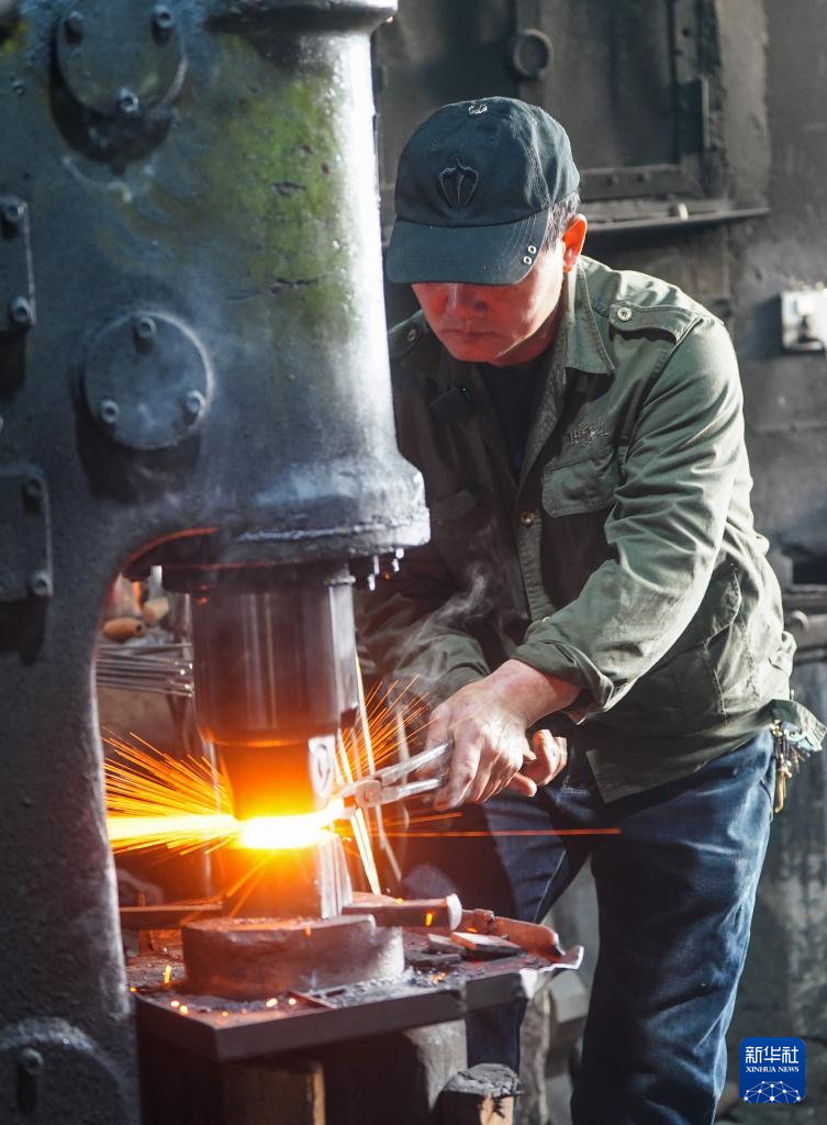 蓝炳忠在铁匠铺用空气锤锻打一把镰刀(12月7日摄)。