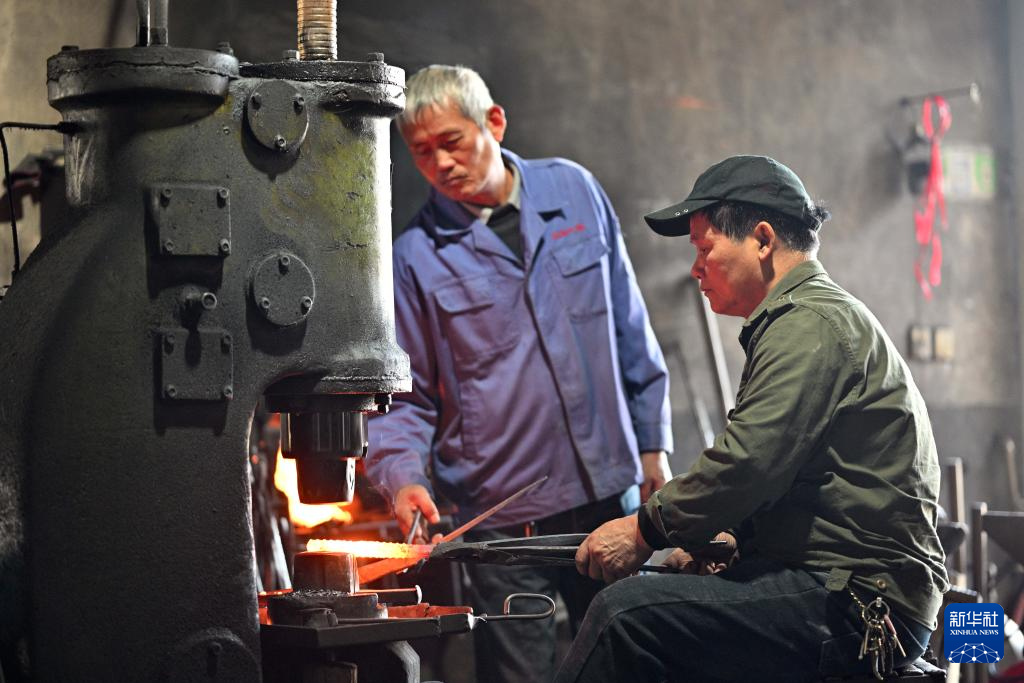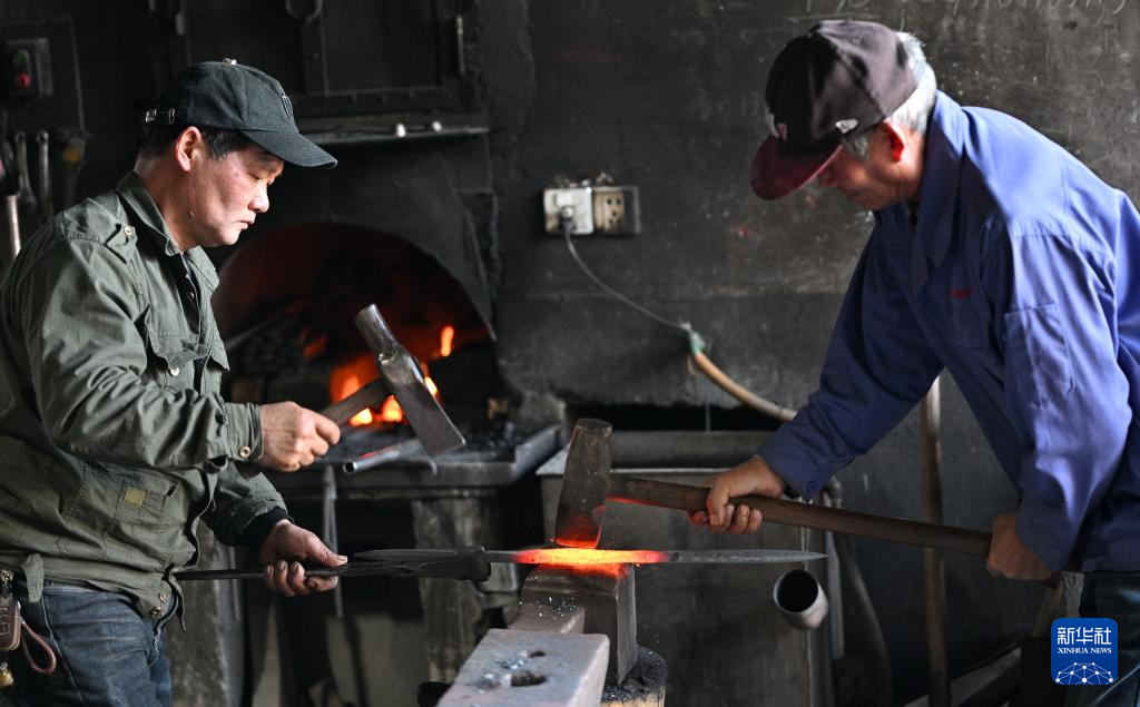 蓝炳忠(左)和他的叔叔在铁匠铺里打制两齿锄头(12月7日摄)。
