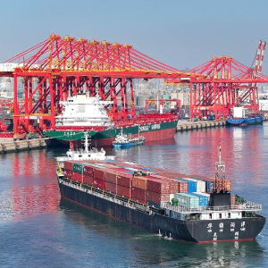 在山东港口日照港,货轮停泊集装箱码头装卸作业(2024年1月10日摄,无人机照片)。
