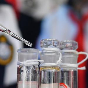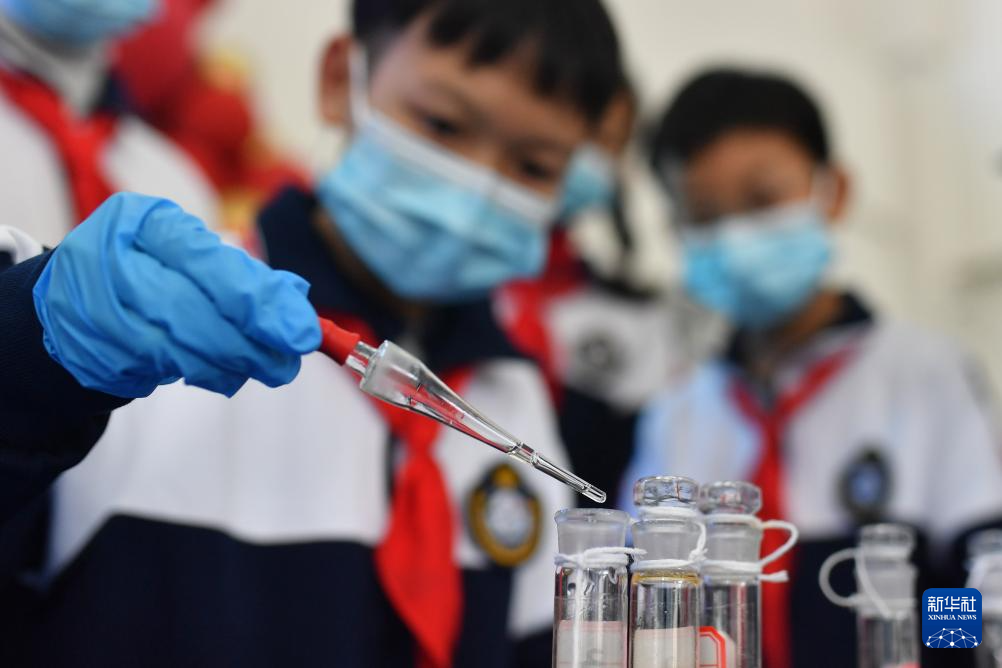 3月20日,在山东省青岛市市北区宁安路小学开展的“滴水在指尖 节水在心间”主题活动上,一名学生在做污水净化小实验。