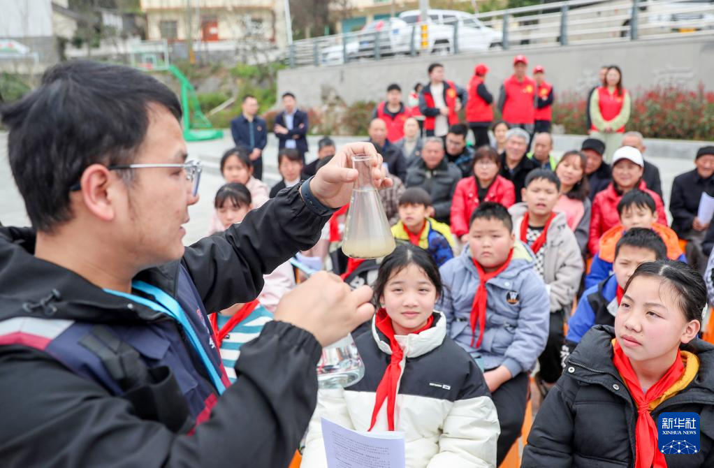 3月20日,四川省华蓥市疾控中心的志愿者在天池湖畔为学生讲解水质常识。