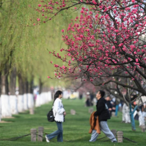 3月26日,游客在杭州西湖景区的白堤上游览。