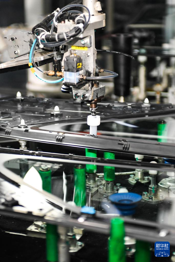这是4月24日拍摄的广州广汽埃安新能源汽车的全自动化轮胎安装工作站。