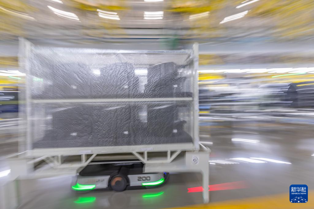 在位于重庆市两江新区的赛力斯汽车超级工厂,物流机器人在总装车间内自动运输物料(4月25日摄)。