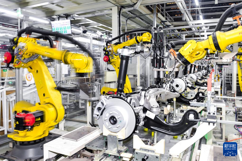 在位于吉林长春的中国一汽红旗制造中心蔚山厂区总装车间内,生产线上的智能机械臂对车辆后桥进行装配作业(4月24日摄)。