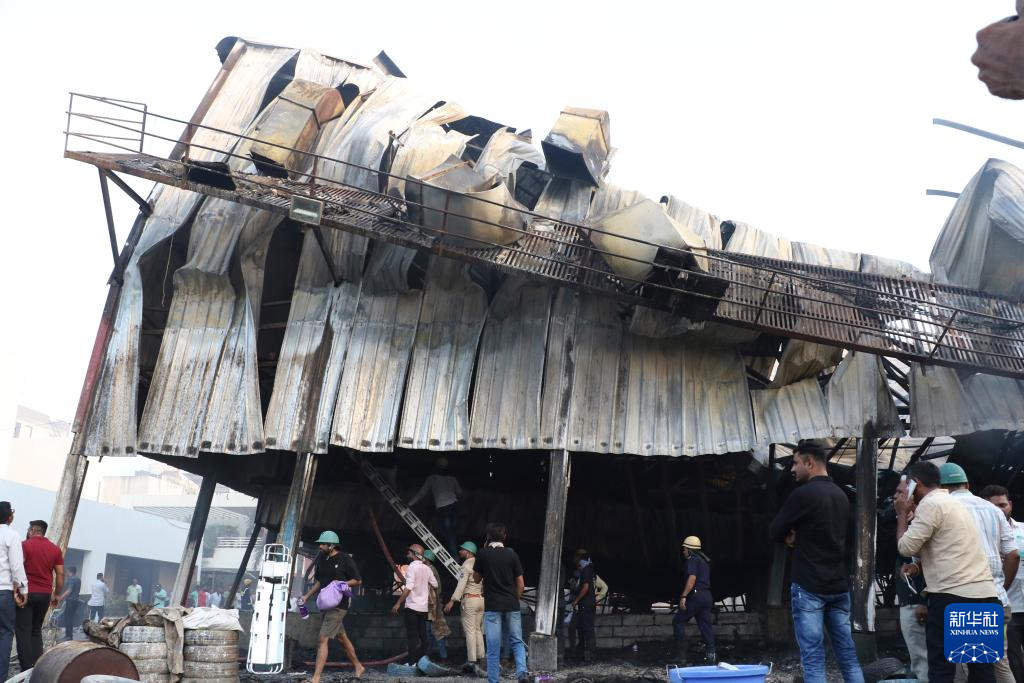 5月25日,人们聚集在印度古吉拉特邦拉杰果德市的火灾现场。