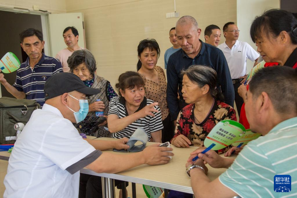 6月15日,福建武夷山市市级避灾安置点海亮研学基地内,医疗人员为转移群众提供测量血压、健康宣传等服务。