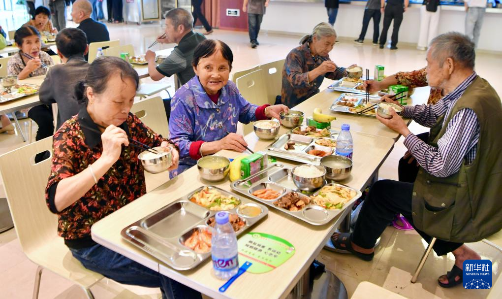 6月15日,福建省武夷山市因暴雨转移群众在避灾安置点海亮研学基地食堂用餐。