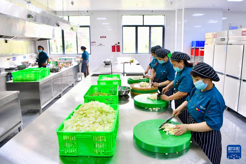 6月15日,福建武夷山市市级避灾安置点海亮研学基地食堂员工为因暴雨转移群众准备午餐。