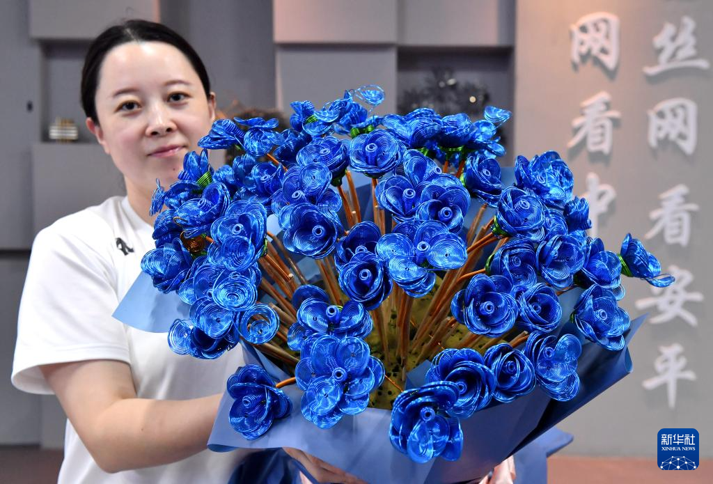 8月30日,安平县国际丝网展览馆工作人员在展示丝网制作的工艺品。