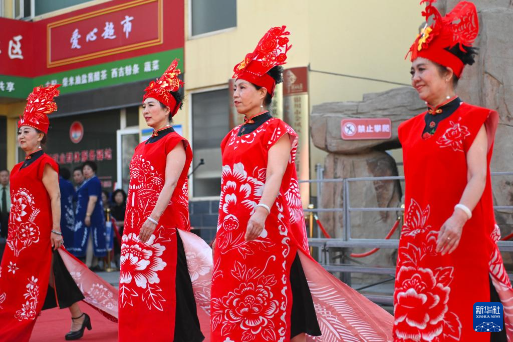 9月25日,居民在长城花园社区广场表演剪纸服装走秀。