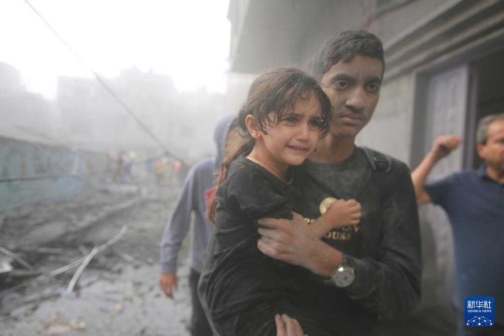 2023年10月12日,在加沙地带南部城市拉法,一名男子抱着小女孩走在遭以色列空袭的受损建筑旁。