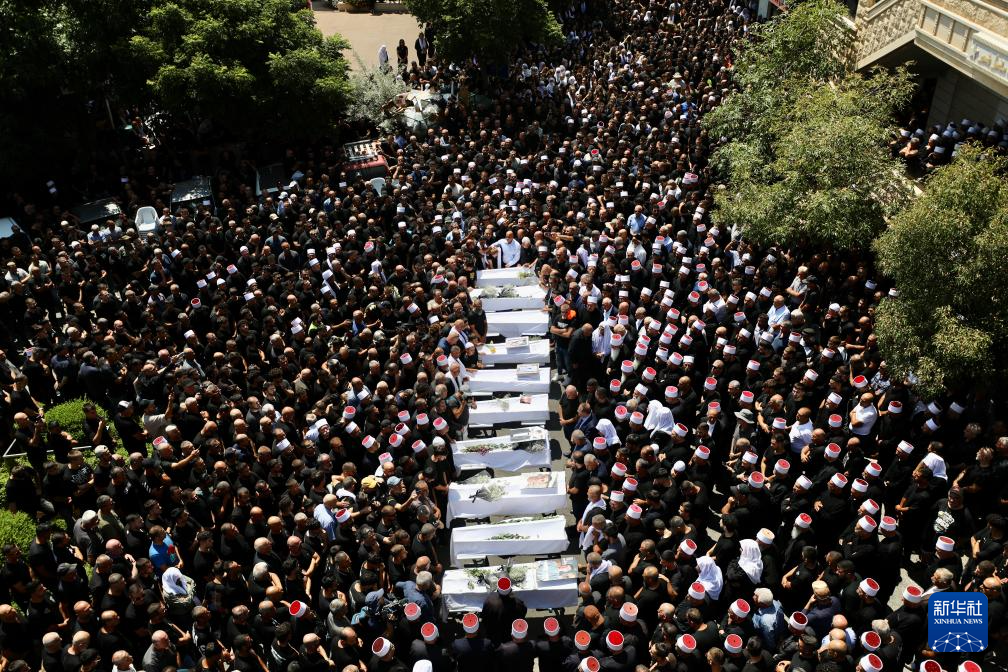2024年7月28日,在以色列占领的戈兰高地城镇迈季代勒舍姆斯,人们参加黎巴嫩真主党火箭弹袭击遇难人员的葬礼。