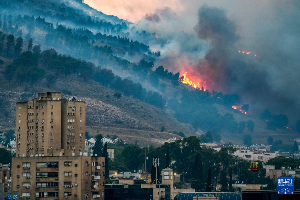 这是2024年6月3日在以色列北部谢莫纳镇郊外拍摄的黎巴嫩真主党火箭弹袭击引发的山火。