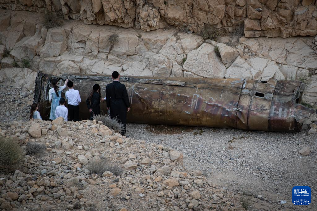 2024年4月28日,在以色列南部城市阿拉达附近,人们围观伊朗导弹残骸。