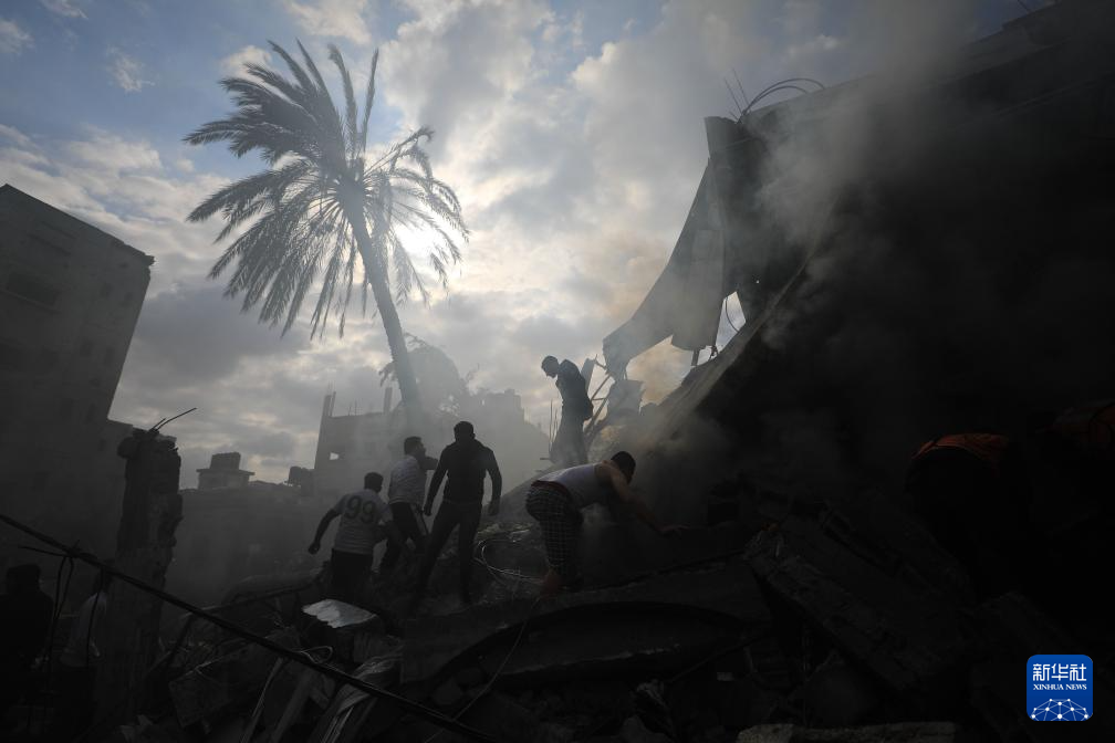 2023年10月10日,人们在加沙地带的加沙城查看被以色列空袭炸毁的建筑废墟。