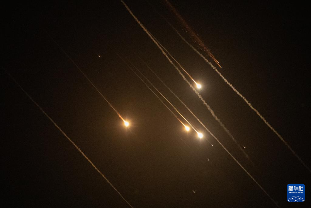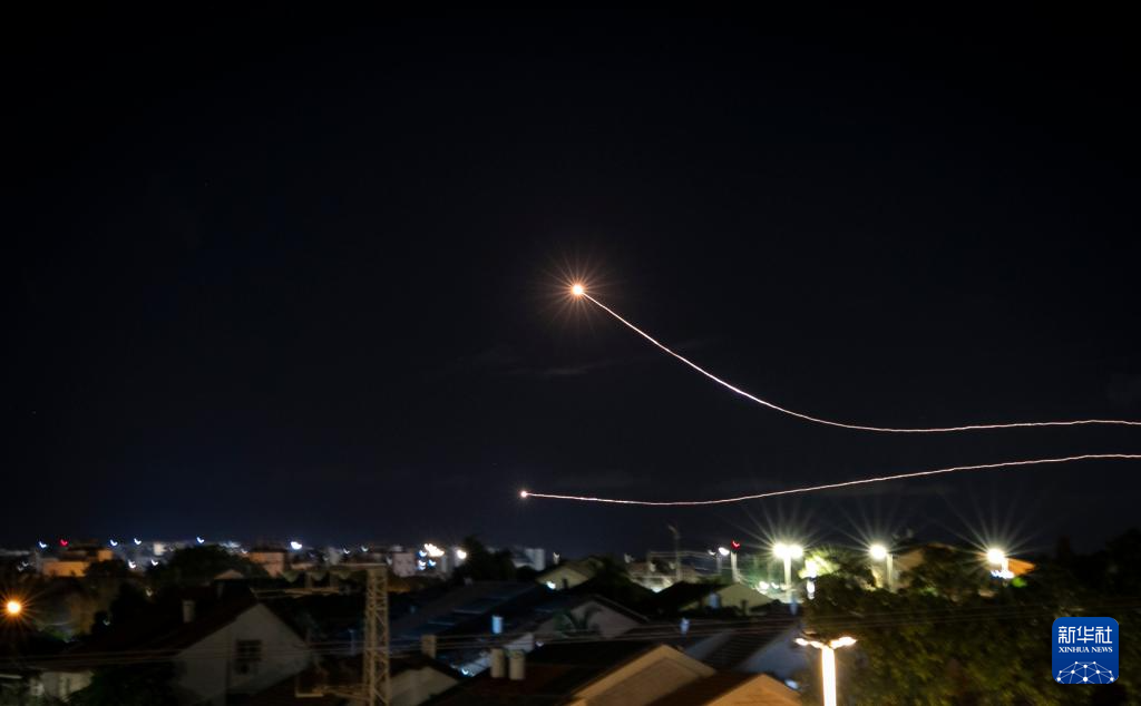 这是2023年10月20日在以色列南部边境城市内提沃特拍摄的以色列“铁穹”防空系统拦截火箭弹的画面。当晚,来自加沙地带的火箭弹不断射向以色列南部边境城市,以色列“铁穹”防空系统划破夜空进行拦截。