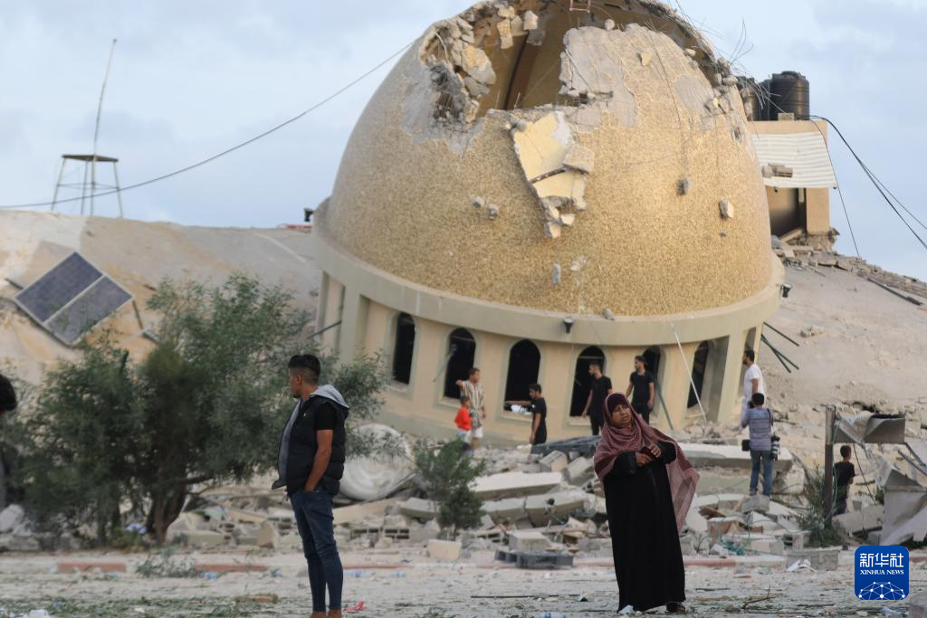 2023年10月8日,在加沙地带南部城市汗尤尼斯,人们站在一座被以色列空袭炸毁的清真寺旁。