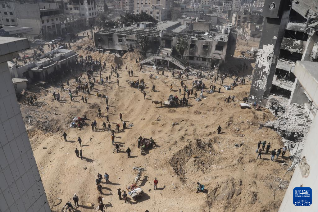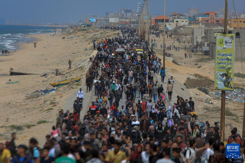 这是2024年4月14日在加沙地带中部拍摄的向北返家的人群。巴勒斯坦加沙地带消息人士称,以色列军队当天允许部分巴勒斯坦人返回加沙地带北部地区。