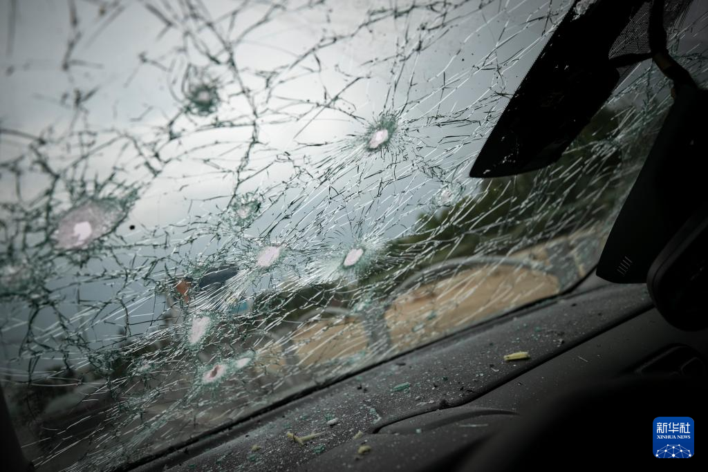 这是2023年10月9日在以色列南部城市阿什凯隆拍摄的遭火箭弹袭击的汽车。阿什凯隆距离加沙边境约十公里,在此轮巴以冲突中受影响较大。