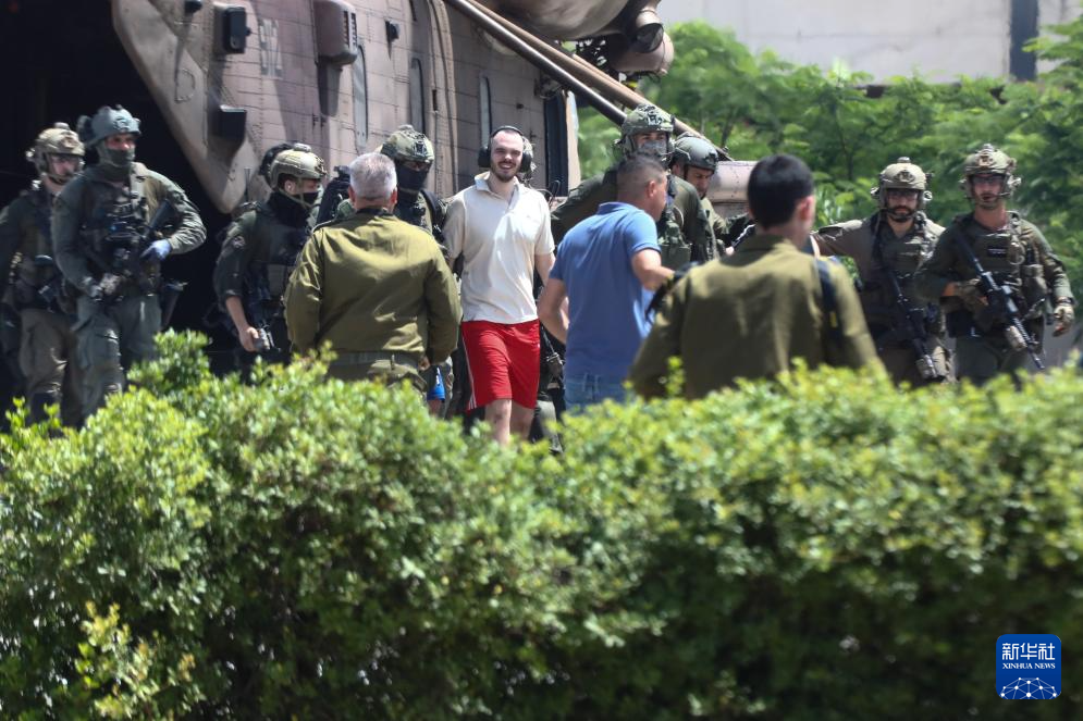 2024年6月8日,一名被解救的以色列人乘机抵达以色列拉马特甘的一家医院。以方当天从加沙地带解救了4名此前被巴勒斯坦伊斯兰抵抗运动(哈马斯)扣押的以色列人。