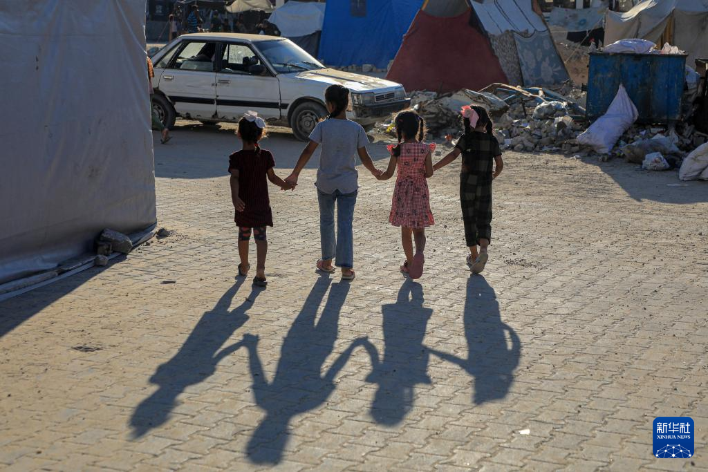 2024年8月20日,在加沙地带南部城市汗尤尼斯,孩子们站在一处废墟旁。