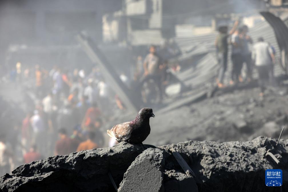 2023年10月26日,在加沙地带南部城市汗尤尼斯,一只鸽子停留在建筑废墟上。